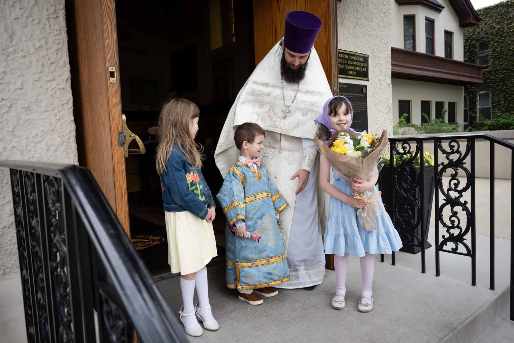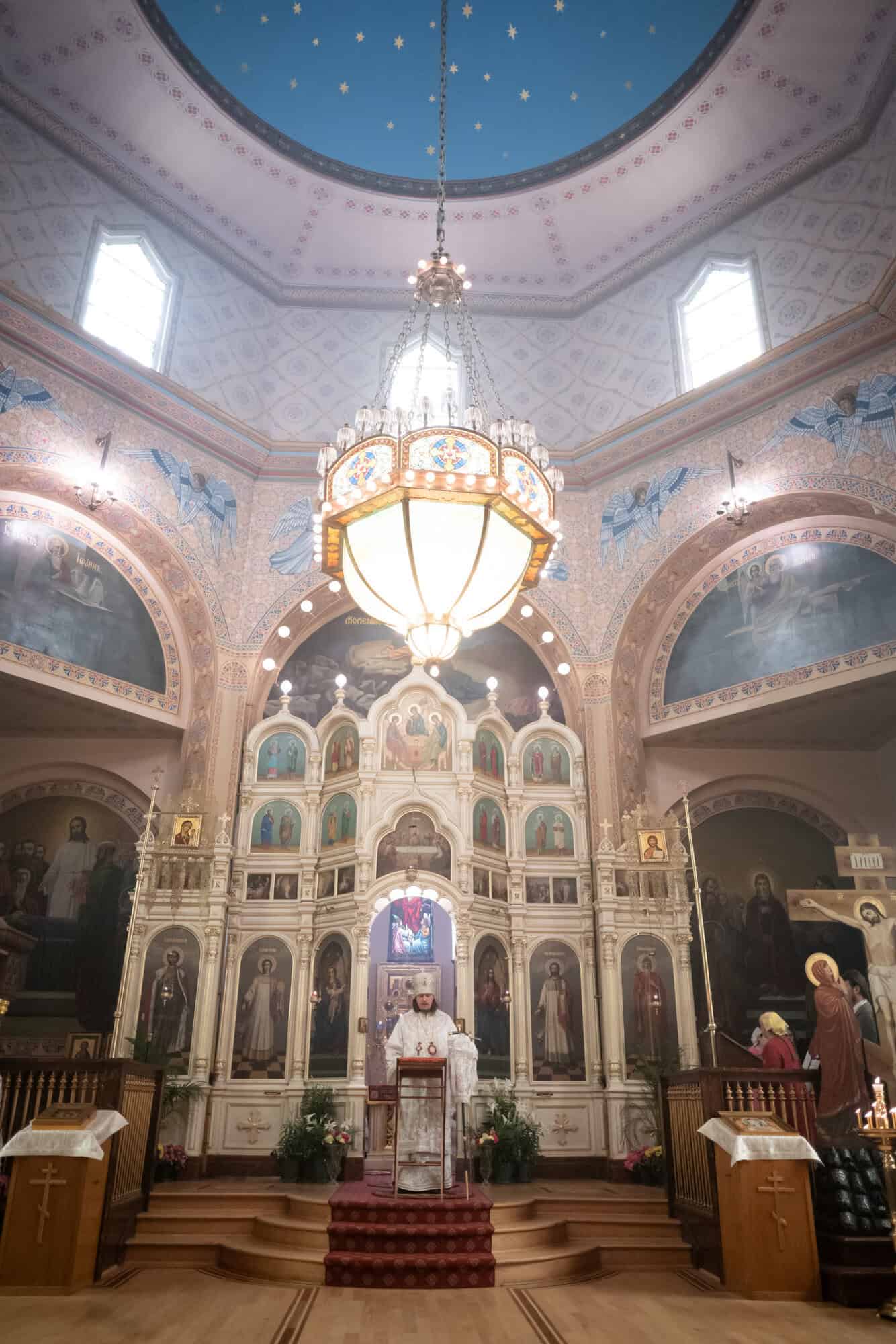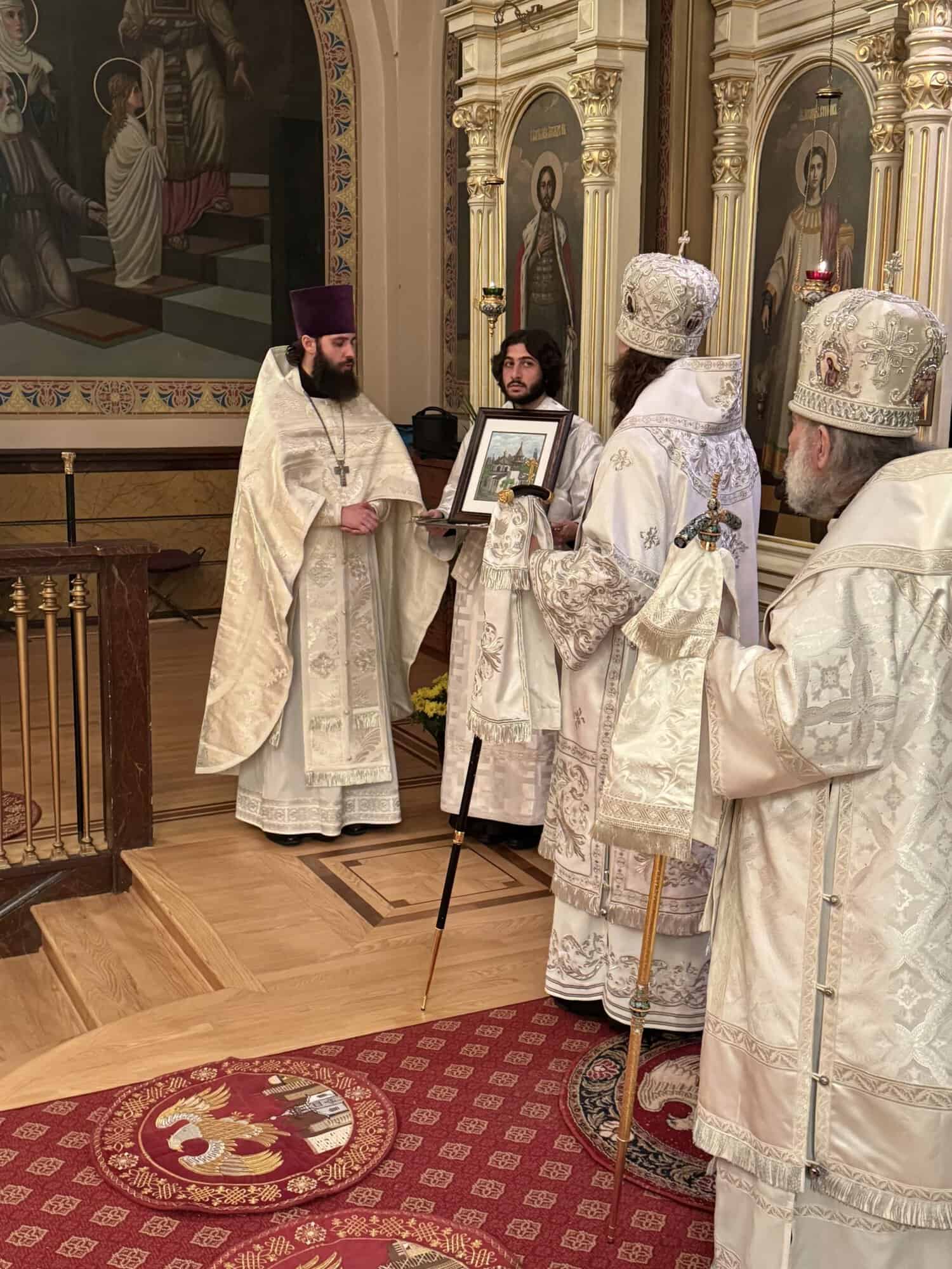 Following the liturgy, His Eminence welcomed Bishop Vasily, noting the historical ties between the two diocese in his address to the bishop. In return, Bishop Vasily expressed his gratitude for the invitation to visit the Diocese of the Midwest and for the opportunity to serve at the Cathedral. Fr. Alexander presented His Grace with a hand-painted portrait of the historic Cathedral the was done by the hand of one of the Cathedral parishioners.