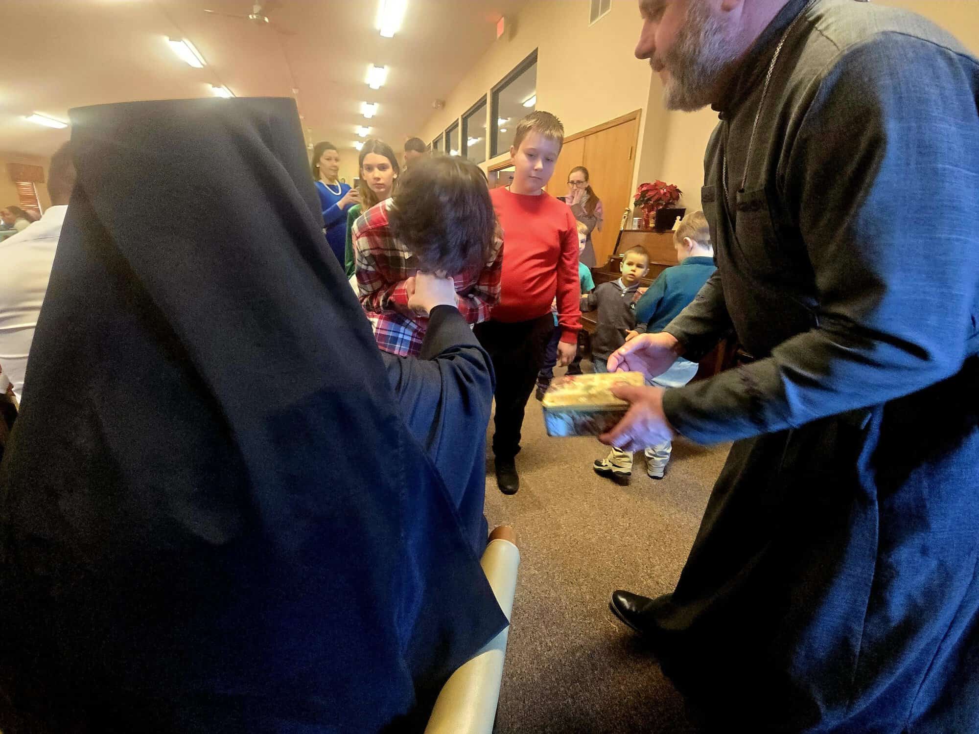 Following the Divine Liturgy, a festive meal was held in the hall. During this time, the Church School held a drawing competition and sang carols for the feast. The Archbishop distributed gifts to the children that were gathered for the feast.