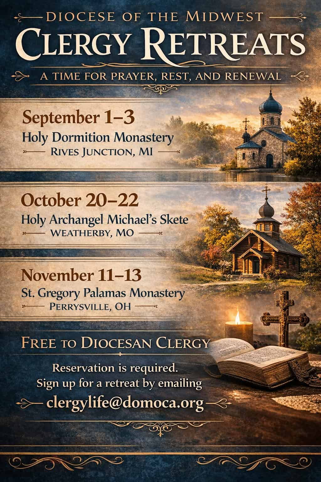CHICAGO, IL [DOM] – The Department of Clergy Health and Family Life of the Diocese and the Midwest has announced the launching of a new initiative in 2026: Small Group Clergy Retreats. These retreats are offered at no expense to diocesan clergy. However, space is limited. Clergy may reserve a place at any one retreat by emailing the department at clergylife@domoca.org. The dates and locations of the retreats are as follows: