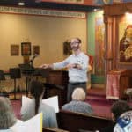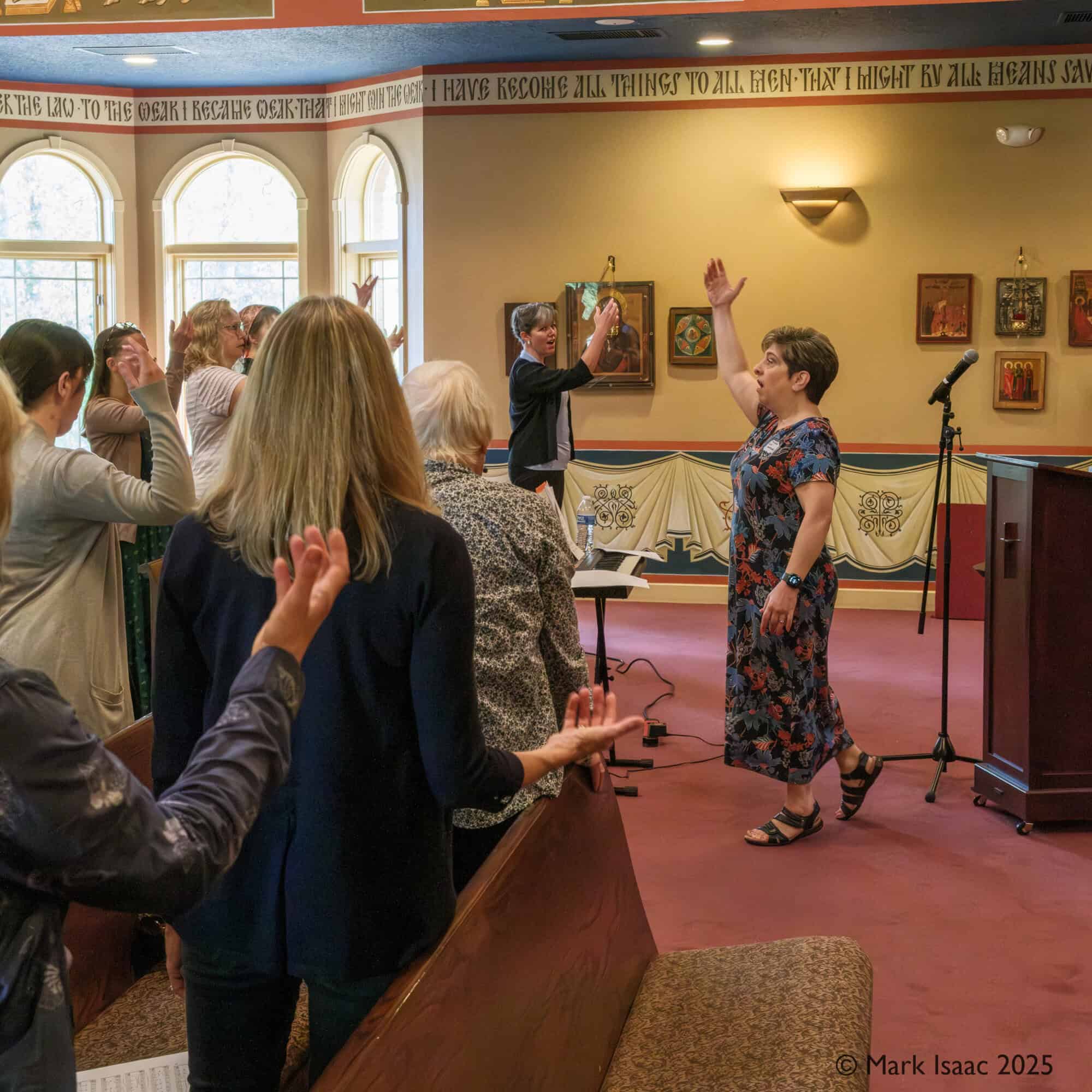 Saturday’s workshop continued with a full day of conducting training, music instruction, rehearsals, and fellowship, all leading up to Great Vespers. Matushka Vickie led an in-depth session in the morning, exploring chant and its connection to liturgical text, while singing through examples with the participants. After a delicious lunch prepared by local parishioners, conductors Protinica Michelle and Jonathan led two choirs in rehearsals to sing antiphonally during Great Vespers. Meanwhile, Ms. Amedee worked with the children’s choir to prepare a beautiful Valaam Chant arrangement of “Blessed is the Man.”
